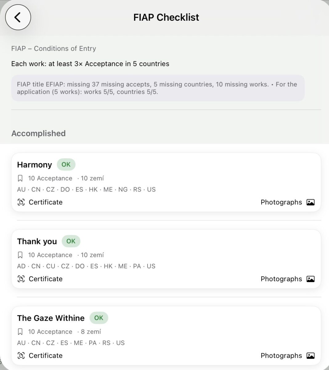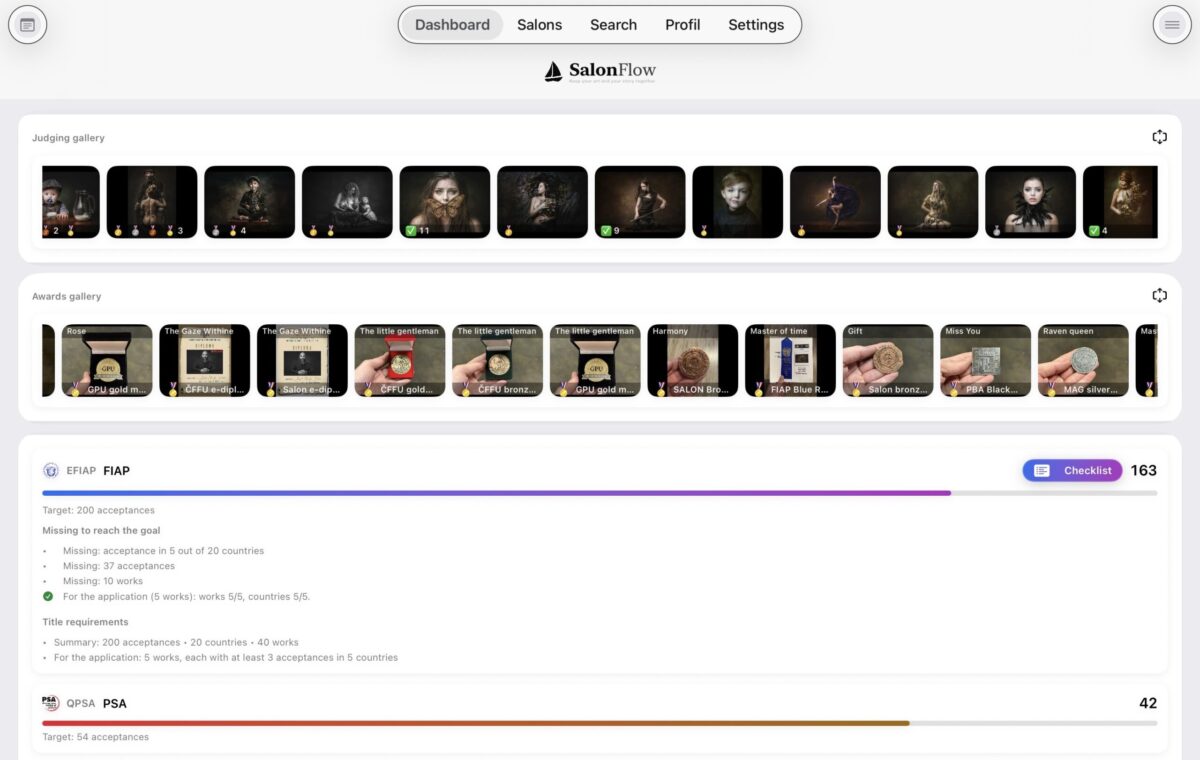 SalonFlow is built to support FIAP and PSA distinctions. It shows how many acceptances you have, in how many countries and across how many works, so you can see exactly what is still missing before you apply for your next title.
