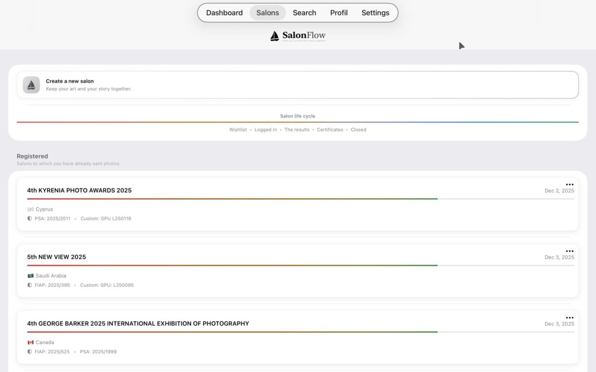 SalonFlow is a smart logbook for photo salons and competitions. It keeps all your salons, circuits, sections and results in one place, instead of in dozens of spreadsheets and scattered notes.