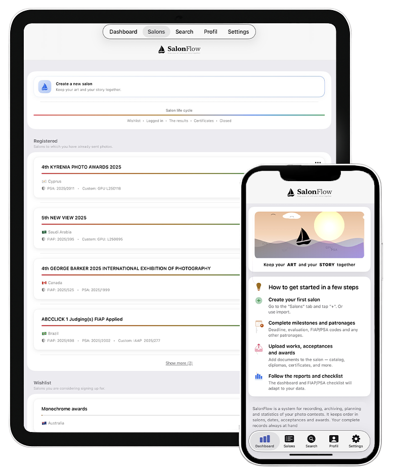 SalonFlow helps you plan salons, search FIAP/PSA, track deadlines, log acceptances and awards, and follow your progress towards FIAP and PSA distinctions – all in one place, in one app. All data stays on your device and is never sent to third parties.