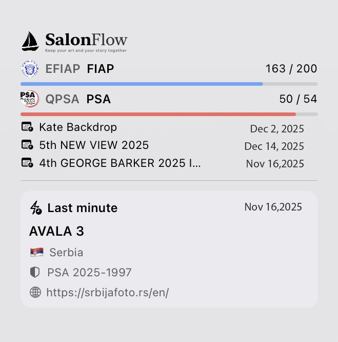 With the SalonFlow widget you see your FIAP/PSA progress, the next results coming in and a new last-minute salon to enter every single day. It’s like having a tactical map of the salon circuit on your Home Screen.